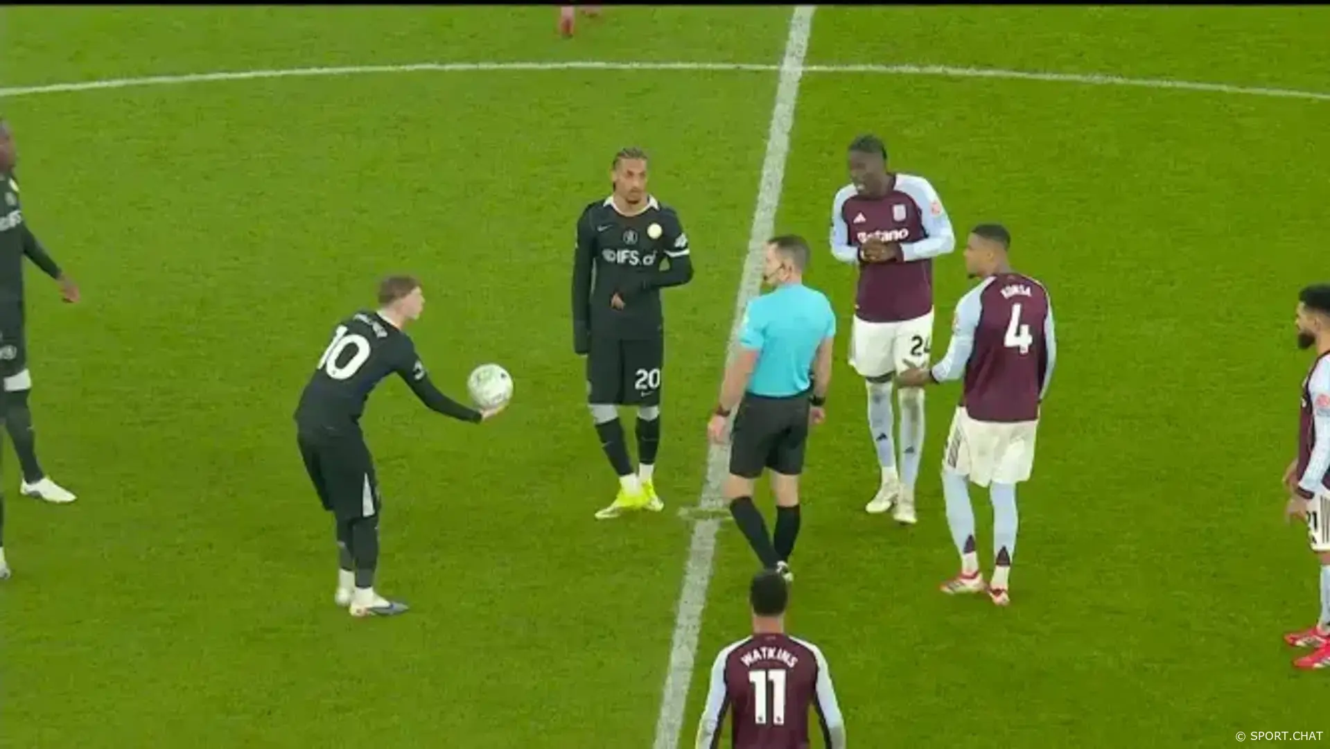 Такое расположение игроков фактически заблокировало старт второго тайма и сразу вызвало протесты со стороны футболистов «Астон Виллы». Амаду Онана и Олли Уоткинс активно обращались к арбитру Джарреду Джиллетту, требуя вмешательства.